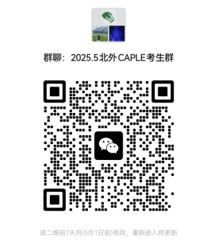 请已报考2025年5月北外考点CAPLE考试的考生扫码入群,并将群备注改为个人真实姓名+考试等级。如二维码已过期,请联系考点邮箱入群:lape_bfsu@163.com